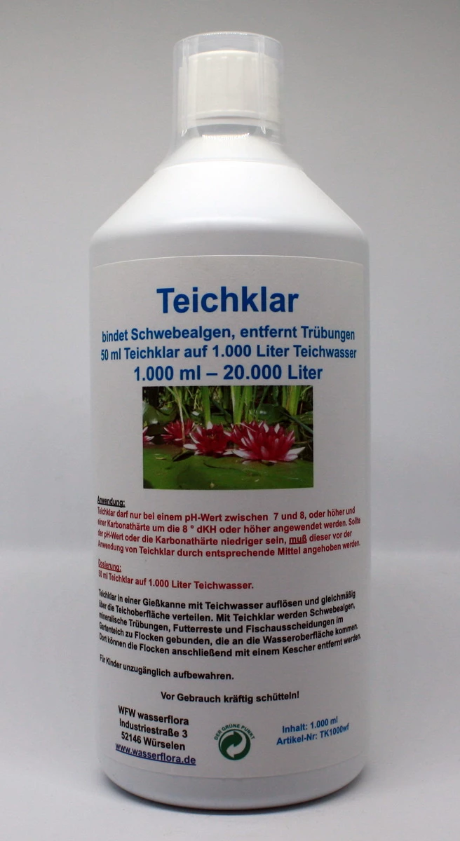 Dosierung: 50 ml Teichklar auf 1.000 Liter Teichwasser.