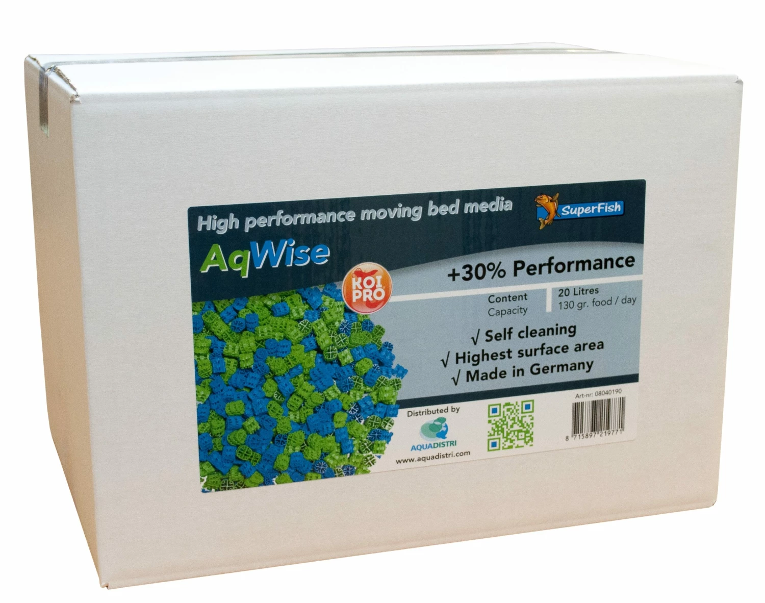 AqWise Filtermedium arbeitet 30% efizienter als alle anderen ähnlichen Filtermedien. Die besonders ausgeklügelte Beschaffenheit liefert 30% mehr Oberfläche. Die spiralformigen Rillen, sowie konstruktiv gestaltete Öffnungen, sorgen für einen optimalen Wasserwirbel und perfekter Ab- und Zufuhr von Bakteriennährstoffen und Sauerstoff. Eine Verstopfung ist wegen der selbstreinigenden Wirkung der Kunststoffringe ausgeschlossen. AqWise ist besonders geeignet für Flutungsbettfilter (Bead-Filter) wie dem Poly Tech Move Filter.