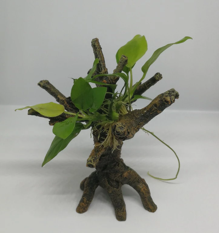 Goldenes Speerblatt-Bäumchen mit Baumkrone / Urwaldbaum KLEIN mit Anubia nana GOLD-BLATT