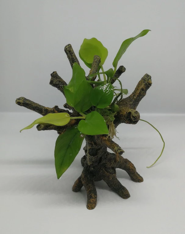 Der robuste Stamm der Deko-Wurzel hat eine schöne Verästelung und Zwergspeerblätter Anubias nana GOLD-BLATT bildet die Blattkrone. Urwaldbäume werden in speziellen Klimazelten kultiviert, so dass sie in jedem Aquarium sofort gut weiterwachsen. Im Aquarium bilden die Urwaldbäume dichte, sattgrüne „Blattkronen“. Für Ihre Fische bieten Urwaldbäume Reviergrenzen, Rückzugsmöglichkeiten und Laichplätze. Die Pflanze kann mit der Deko-Wurzel sehr schnell umgesetzt oder aus dem Aquarium entnommen werden. Also sehr praktisch beim Herausfangen von Tieren aus dem Aquarium – hervorragend geeignet für Zuchtbecken. Die Deko-Wurzel besteht aus unverrottbarem Kunststoff mit zahlreichen feinen Details. Die Kunststoffwurzel hat keine scharfen Ecken und Kanten – die Verletzungsgefahr für Welse und andere Raspler ist somit absolut minimiert. Im Gegensatz zu Naturwurzeln gibt die Kunststoffwurzel keine Tannine ab, somit wird das Wasser nicht verfärbt.