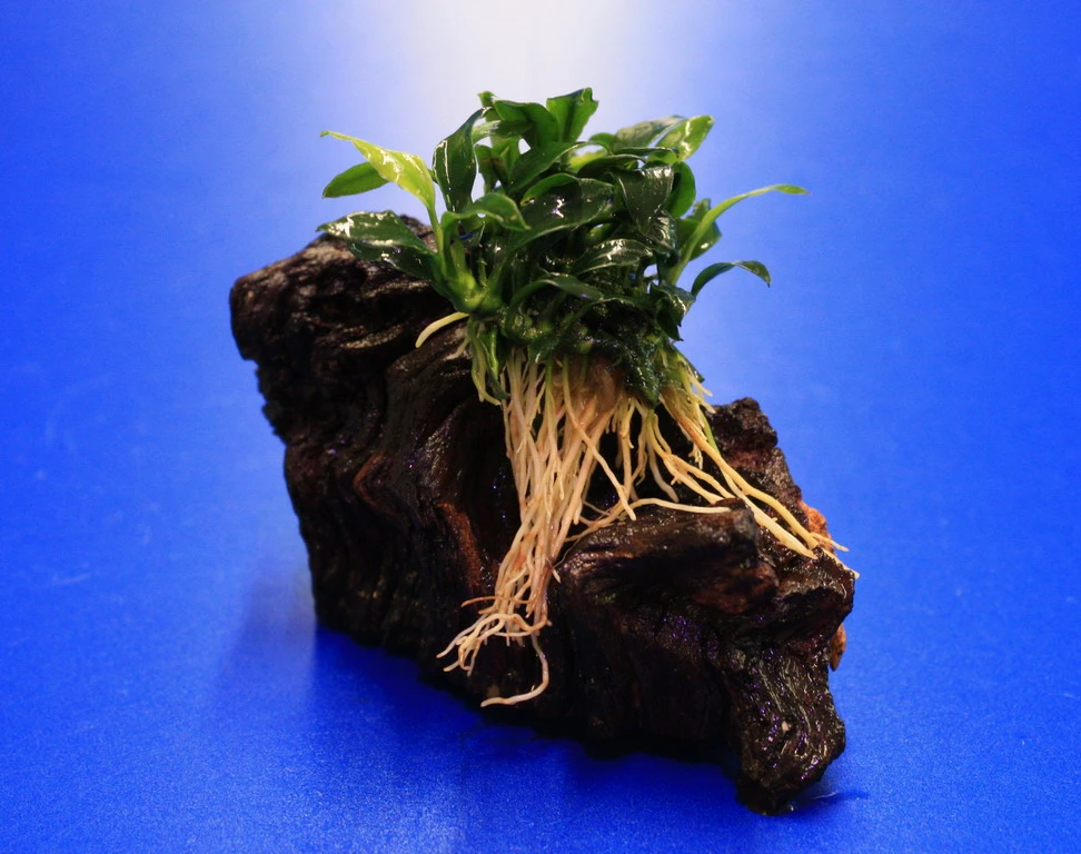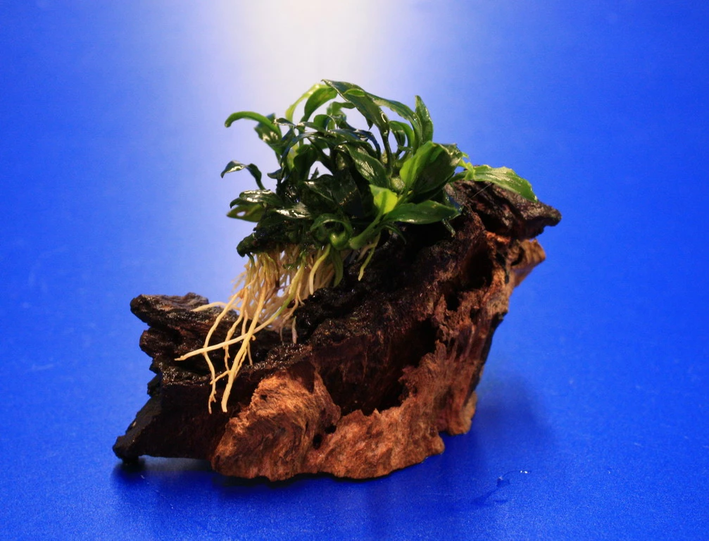 Die schöne kräftige Pflanze ist mit einer Schnur auf einer Wurzel aufgebunden. Wenn die Pflanzen angewachsen sind, kann die Schnur entfernt werden. Die ideale Bepflanzung für Barschbecken und anderen pflanzenfressenden Besatz. Die Pflanze kann mit der Wurzl sehr schnell umgesetzt oder aus dem Aquarium entnommen werden. Also sehr praktisch beim Herausfangen von Tieren aus dem Aquarium – hervorragend geeignet für Zuchtbecken.