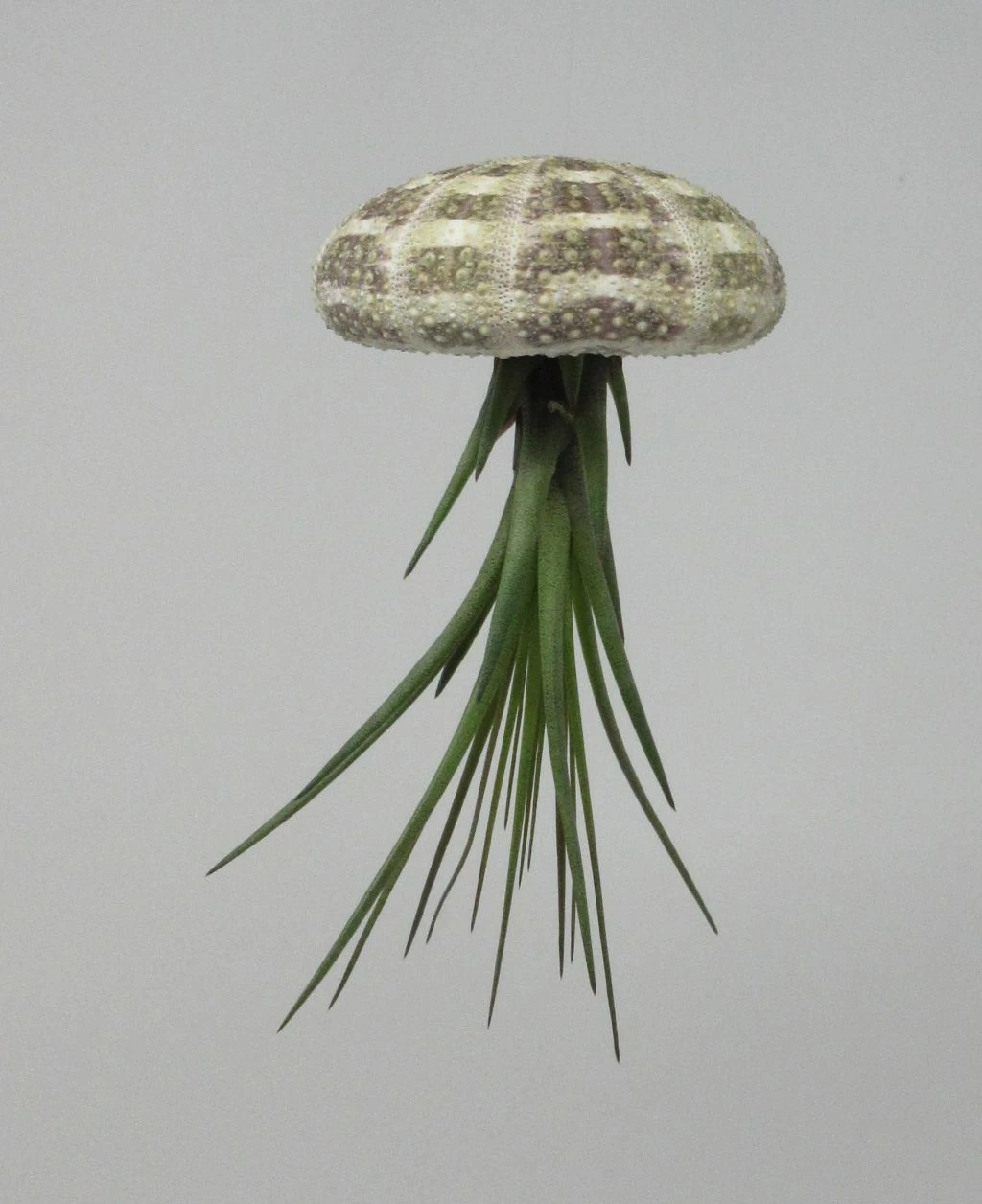 Das Seeigelgehäuse dient als dekoratives Gefäß für Tillandsia tricolor, eine Sorte der Luftpflanze, die für ihre vielfältigen Farben und zarten Blätter bekannt ist. Diese Pflanze verleiht dem Arrangement eine lebhafte und farbenfrohe Note und sorgt für einen Hauch von Frische und Naturschönheit. Es erinnert an freischwebende Quallen oder Tintenfische.